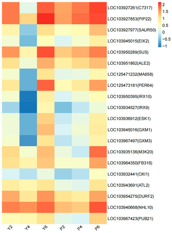 Expression heat map of 20 key core genes. The abscissa is the sample name, and the ordinate is the gene name. The closer the color is to red, the higher the expression is. The initial sample of calyx tube shedding (Y2, P2); mid-shedding samples (Y4, P4); samples at the end of shedding (Y6, P6).