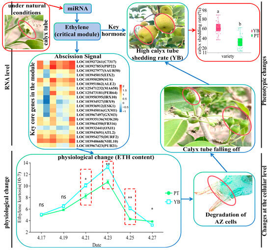 Mechanism diagram of calyx tube shedding based on WGCNA analysis. In the expression heat map of 20 key core genes, the closer the color is to red, the higher the expression level is. In the ethylene content map, the asterisk and double asterisk indicate significant differences at the p < 0.05 and p < 0.01 levels, respectively. In the statistical diagram of the calyx removal rate, a and b indicate that there is a significant difference between the two varieties. The red dotted line frame indicates the three critical periods of calyx tube shedding. ns indicates that there is no significant difference between the two varieties.
