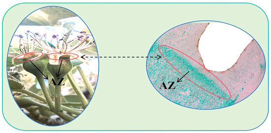 Schematic diagram of calyx tube abscission zone sampling. The left image is the appearance of the detachment zone, and the right image is the cell image of the detachment zone under the 5× objective lens.