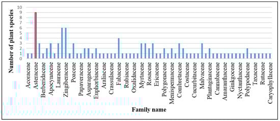 From the three subdivisions of the Darjeeling District, a sum of 115 species of medicinal plants were recorded, which spread over 65 families and 104 genera. Here, a total of 93 plant species belonged to dicots, 17 species were from monocots, 3 species were pteridophytes, and only 2 species were listed from gymnosperms (Table 2). The Asteraceae family had nine species, the highest number of species recorded, which covered 7.9% of the total number of species listed in the present study. The second largest families with respect to recorded species were Lamiaceae and Zingiberaceae, with six species and 5.3% of the total number of recorded species in each of these two families. The Fabaceae ranked the third largest family, with a total of four species, which represent 3.6% of the total species recorded. Each of the seven families with three species, accounting for 2.6% of total species, belonged to the families Amaryllidaceae, Apocynaceae, Lauraceae, Poaceae, Malvaceae, Myrtaceae, Piperaceae, Urticaceae, and Combretaceae. Each of the eleven families of Saxifragaceae, Solanaceae, Asparagaceae, Euphorbiaceae, Polypodiaceae, Phyllanthaceae, Plantaginaceae, Rosaceae, Polygonaceae, Apiaceae, and Menispermaceae represented two species, accounting for 1.7% of the total plant species recorded. The remaining 41 families had single-species representation, constituting 19% of the total noted species for each family (Figure 1).