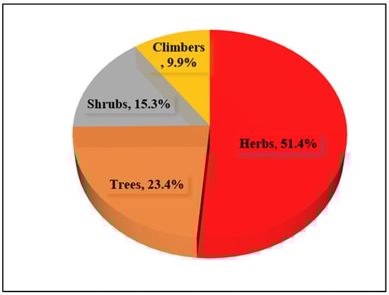 The reported plant taxa are classified into four categories based on their habits, namely, herbs, shrubs, climbers, and trees. From the present study, the herbs contributed the highest number of species, 57, which shared 51.4% of the reported taxa. Trees represent the second largest group, with a total of 26 species and 23.4% of total species recorded, followed by the shrub group, with 17 species (15.3%), and climbers, with 11 species (9.9%) (Figure 2).