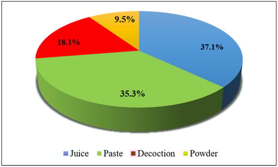 It was noticed that respondents in the study area used numerous methods of recipe preparation. Four different methods were employed for the preparation of remedies. The most common method of medicine preparation was juice (37.1%), followed by paste (35.3%), decoction (18.1%), and powder (9.5%) (Figure 4).