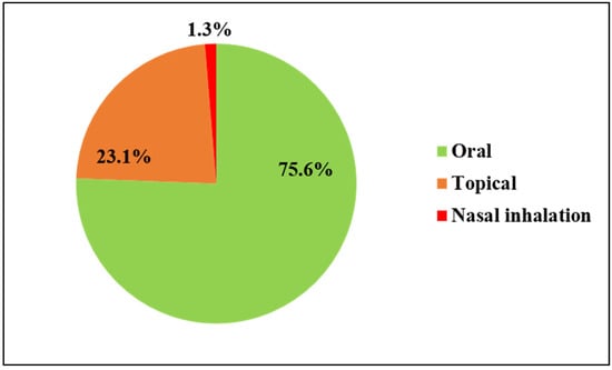 In the present study, it was noted that the oral route of remedy administration is more prevalent (75.6%) than other routes, like topical (23.1%) and nasal inhalation (1.3%). Similar to this study, numerous previous investigations have highlighted that in the majority of cases, folk medicaments are administered through the oral route [43,56,57]. Oral administration is usually practiced, as it makes it convenient to use and consume the medicine, and it is more effective. Along with oral administration, topical application remains an important method of herbal drug administration to cure ailments such as wounds, skin diseases, and body pain. Topical use, specifically poultice, enhances blood circulation in the affected areas and provides a protective layer, shielding infected wounds or sores from further microbial infection. Additionally, the herbal ingredients in the poultice contain antiseptic essential oils, phenolics, tannins, and other bioactive chemicals that penetrate the dermal tissues, aiding in the fight against microbial infection and reducing inflammation. This ultimately promotes wound healing [41].