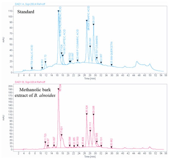 HPLC chromatogram obtained from methanolic bark extract of B. alnoides.