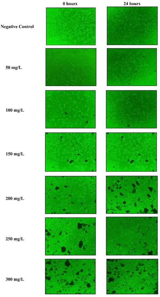 The methanolic bark extracts of B. alnoides were tested at concentrations ranging from 50 to 300 mg/L employing the MTT assay, and the impact on the cell line was evaluated after 24 h of cell exposure to the extracts. The results demonstrated a concentration-dependent increase in cell mortality, with percentages of 10.8 ± 0.45% at 50 mg/L, 21.08 ± 0.51% at 100 mg/L, 31.03 ± 0.49% at 150 mg/L, 40.21 ± 0.66% at 200 mg/L, 45.11 ± 0.74% at 250 mg/L, and 54.17 ± 0.57% at 300 mg/L (Supplementary Table S2). Toxic effects were observed at all concentrations higher than 100 mg/L, as indicated by a change in cell morphology from its typical spindle shape to an oval shape (Figure 7). A statistical analysis revealed a significant positive correlation (p < 0.05) between extract concentration and cell mortality, with a clear revelation of increasing cell mortality percentage with respect to enhancing the extract concentration. A non-linear regression analysis estimated the CC50 value of the methanolic bark extract to be 270.07 ± 1.32 mg/L, highlighting the potent effects of the extract on cell viability.