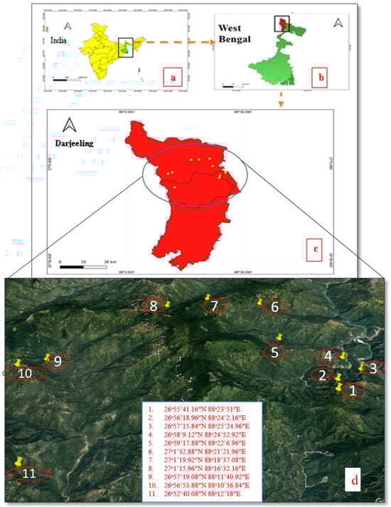 The current study was conducted in three subdivisions of the Darjeeling District, namely, Kurseong, Darjeeling Sadar, and Mirik. In general, Darjeeling Himalaya falls under subtropical per humid climates, with daily mean temperature varying from 17 °C to 8 °C. The region receives 3372.75 mm of rainfall on an annual average [108]. This region spans between 26°57′16″ N and 88°25′2″ E and covers an area of 2090 km2. Numerous ethnic communities, including Tamang, Chettri, Lepcha, Rai, Limboo, and others, reside in this region. The Darjeeling District has 21.52% Scheduled Tribes and 17.18% Scheduled Castes [109].