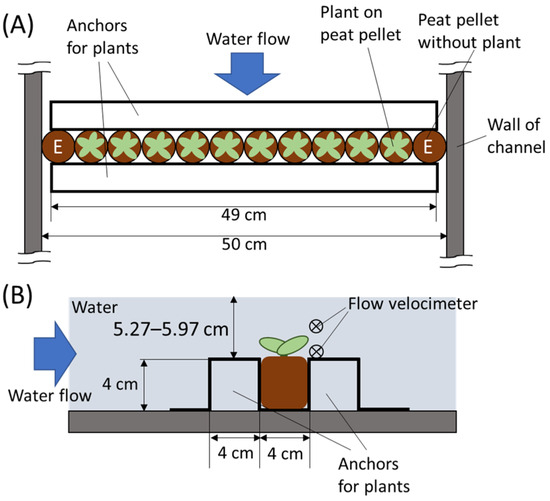 Ten Arabidopsis thaliana plants grown on peat pellet for approximately 4 weeks were fixed by using metal anchors on the open water channel measuring 50 cm in width and 10 m in length, which can artificially create water flow in one direction (Figure 1 and Figure S1). In this system, water inflow was applied from one side, with an equal amount of outflow from the opposite side. The flow rate was monitored by flow velocimeters with propeller of 1 cm diameter. We adjusted the flow rate to 2 L/s and 8 L/s, which is equivalent to 5 cm/s and 30 cm/s, respectively. To modulate the water depth, the weir height at the downstream end of the water channel was adjusted (Figure 1B and Figure S1D,E). In addition, the plants were also subjected to submergence in water with 10 cm depth without physical flow in parallel in a plastic container. Following the exposure to these stresses for 30 min, the number of leaves and rosette diameter were scored from 1 day following the application of stresses. The length of inflorescent stem was measured from 6th day following the application of stresses.