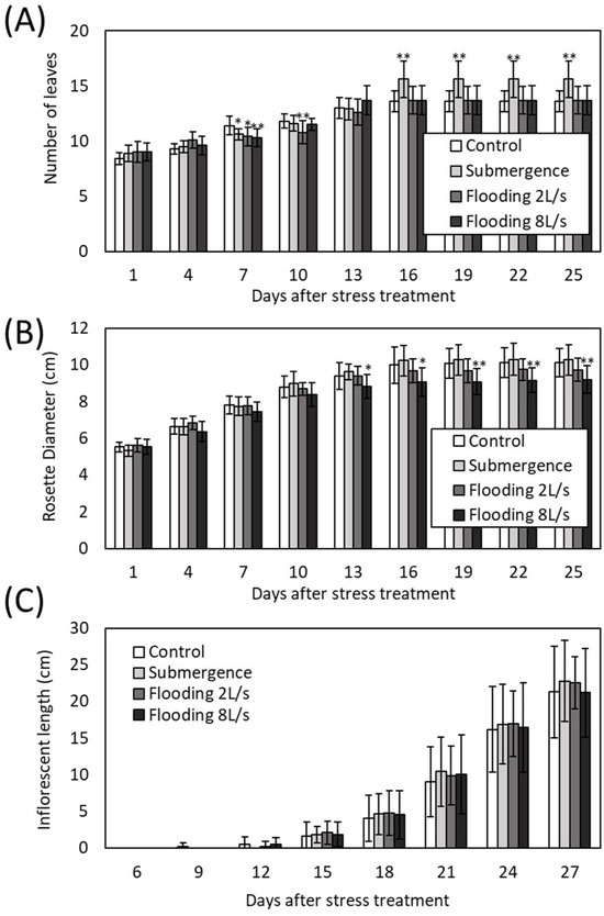 Growth characteristics of plants subjected to submergence or flooding with physical flow. (A) Number of leaves, (B) plant diameter and (C) inflorescent length. Error bars indicate standard deviation (n = 9–10). * and **: Student’s t-test significantly different at p < 0.05 and p < 0.01, respectively (compared to control).