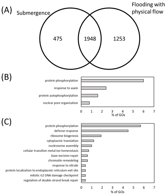 Characteristics of transcripts up-regulated in response to flooding with physical flow. (A) Venn diagram showing the overlap between transcripts up-regulated in response to submergence or flooding with physical flow. (B,C) Gene Ontology (GO) terms of “biological processes” represented in transcripts specifically up-regulated in response to submergence (B) or flooding with physical flow (C).