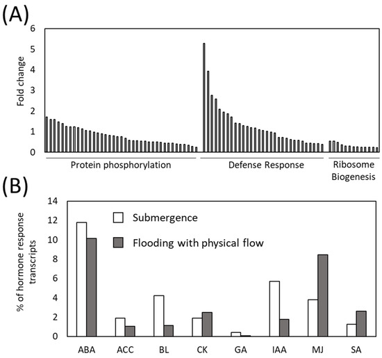 Involvement of pathogen defense pathways in response of plants to flooding with physical flow. (A) Fold change of transcripts belong to Gene Ontologies (GOs) that are highly represented in the transcripts specifically up-regulated in response to flooding with physical flow. (B) Proportion of hormone response transcripts among the transcripts specifically up-regulated in response to submergence or flooding with physical flow. ABA: abscisic acid, ACC: 1-aminocyclopropane-1-carboxylate, BL: brassinosteroids, CK: Cytokinin, GA: gibberellic acid, IAA: indole-3-acetic acid, MJ: methyl jasmonate, SA: salicylic acid.
