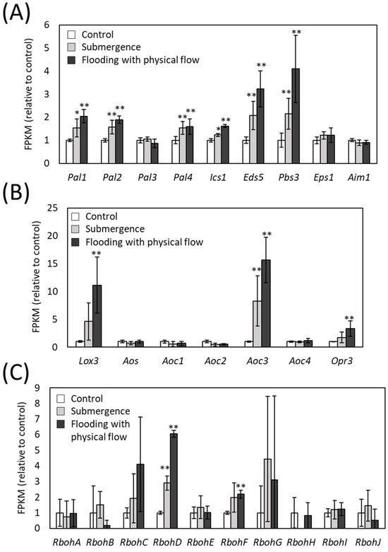 To further confirm the involvement of defense response pathways in the responses of plants to flooding with physical flow, we analyzed the expression of transcripts essential for the synthesis of JA and SA in our transcriptome based on the fragments per kilobase of exon per million reads mapped (FPKM). Expression of key transcripts for SA synthesis was up-regulated by both submergence and flooding. Notably, up-regulation of Pal1, Pal2, Ics1, Eds5 and Pbs3 transcripts in response to flooding tended to be more pronounced compared to that in response to submergence (Figure 5A). Similar trend was also observed in the expression of JA synthesis transcripts, Lox3, Aoc3 and Opr3 (Figure 5B). These results indicate that JA and SA are involved in response of plants to both flooding with physical flow and submergence, but significance of these hormones in the response to flooding with physical flow might be more pronounced. As well as SA and JA, ROS also play pivotal roles in the regulation of defense response pathways. We therefore examined the expression of transcripts encoding Respiratory Burst Oxidase Homologues (RBOHs), ROS producing enzymes, in our transcriptome (Figure 5C). Expression of RbohC, RbohD, RbohF and RbohG showed a tendency to be up-regulated in response to both submergence and flooding. Especially, expression of RbohD was significantly up-regulated in response to both submergence and flooding, with higher expression under flooding. Similarly, significant up-regulation of RbohF expression was also observed under flooding. The roles of RBOHD and RBOHF, as well as SA and JA, in pathogen defense responses of plants have been thoroughly studied [32,33,34,53]. The results of our transcriptome analysis imply that defense responses regulated by the coordination between SA, JA and ROS signaling might play important roles in the response of plants to flooding.