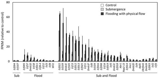 FPKM of transcripts encoding ERFs. Values relative to control are indicated. Error bars indicate standard deviation (n = 3). Transcripts were categorized into three groups; Sub: significantly up-regulated specifically in response to submergence, Flood: significantly up-regulated specifically in response to flooding with physical flow, Sub and Flood: significantly up-regulated in response to both stresses.