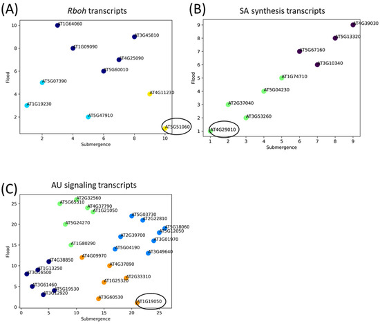 Multiple regression analysis of transcripts involved in ROS production ((A) Rbohs), SA (salicylic acid) synthesis (B) and AU (auxin) signaling (C). Circles indicate the transcript that showed the highest contribution to the determination of rosette diameter under flooding with physical flow. In this figure, the X- and Y-axis values indicate the ranking of transcripts that contribute to the effects on rosette diameter, with lower numbers indicating a higher contribution.