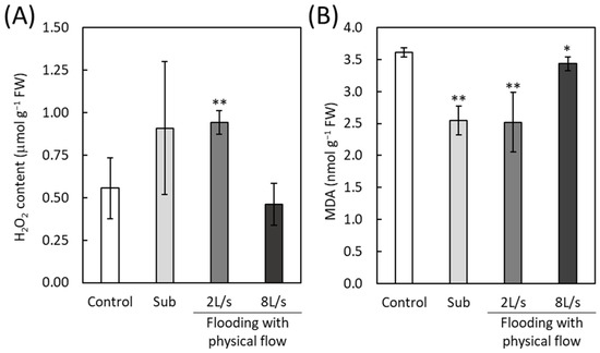 Accumulation of H2O2 (A) and MDA (B) in plants exposed to submergence (Sub) or flooding with different flow rates. Error bars indicate standard deviation (n = 3). * and **: Student’s t-test significantly different at p < 0.05 and p < 0.01, respectively (n = 3, compared to control).