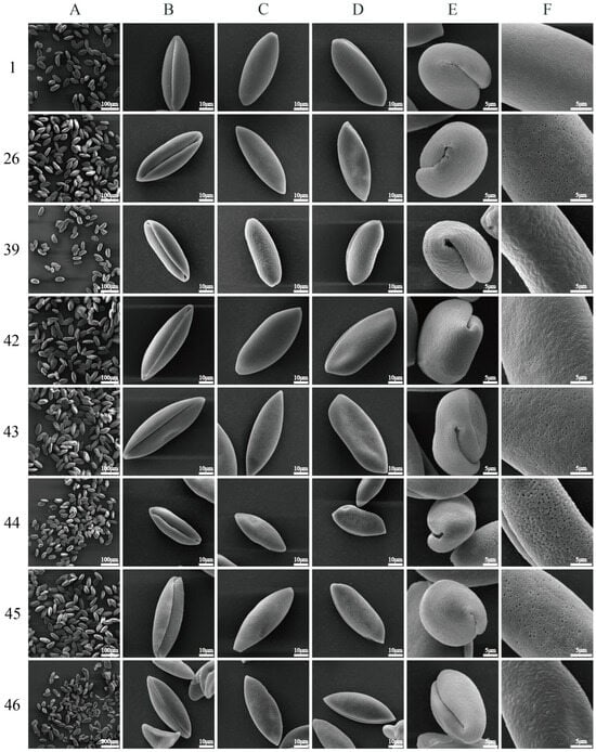 Scanning electron micrographs of pollen morphology of Polygonatum. 1, 26: P. cyrtonema. 39: P. filipes. 42: P. kingianum var. grandifolium. 43: P. kingianum. 44: P. alternicirrhosum. 45: P. macropodum. 46: P. odoratum. Detailed sample information is provided in Supplementary Tables S1 and S2; (A) pollen population (500×, bar: 100 µm); (B) distal view (4000×, bar: 10 µm); (C) proximal view (4000×, bar: 10 µm); (D) long equatorial view (4000×, bar: 10 µm); (E) short equatorial view (8000×, bar: 5 µm); (F) exine ornamentation (12,000×, bar: 5 µm).