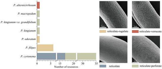 Reticulate–rugulate: tThe surface of the pollen was characterized by a reticulate pattern, with irregular muri that were distinctly rugulate and curved, featuring a few perforations. This ornamentation was observed in six P. filipes germplasm resources (Figure 1 (39), Figure S5 (36F~38F, 40F~41F)) and in the No. 46 material of P. odoratum (Figure 1 (46F)).