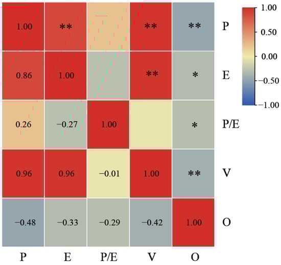 Correlation analysis of pollen morphological characteristics of Polygonatum. O, exine ornamentation. * Indicates a significant difference at the 0.05 level; ** indicates a significant difference at the 0.01 level.