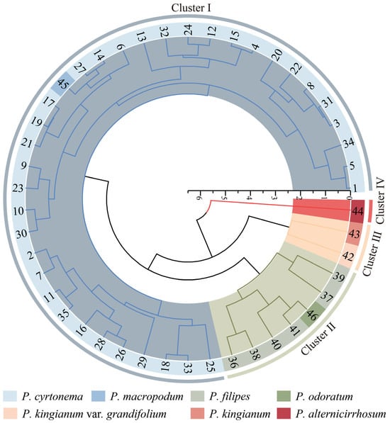 Based on the polar axis length, equatorial axis length, P/E ratio, and exine ornamentation, 46 test materials were subjected to Q-type cluster analysis (Figure 4). The results of the clustering indicate that these materials could be categorized into four distinct clusters. Cluster I comprises 36 germplasm resources. This cluster includes 35 resources of P. cyrtonema and material No. 45 of P. macropodum, indicating a closer genetic relationship between these two species. Additionally, exine ornamentation observed exhibits both reticulate and reticulate–perforate patterns. Cluster II comprises seven germplasm resources. This cluster includes six resources of P. filipes and material No. 46 of P. odoratum, with exine ornamentation exhibiting a reticulate–rugulate pattern. Cluster III contains only two germplasm resources: No. 43 of P. kingianum and No. 42 of P. kingianum var. grandifolium. The characteristics of these species include longer pollen polar and equatorial axis lengths, a larger volume index, larger pollen grains, and exine ornamentation that is reticulate–perforate. Cluster IV contained only material No. 44 of P. alternicirrhosum, whose pollen was the smallest of the 46 test materials and whose exine ornamentation was reticulate–verrucate. Therefore, according to the size and exine ornamentation of pollen, these characteristics reflect the genetic relationship among various Polygonatum germplasm resources to a certain extent, which holds significant taxonomic value. Furthermore, Figure 4 illustrates that there is no apparent correlation between the genetic distance and the geographic distance among the tested materials.