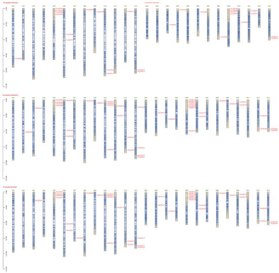 The chromosomal distribution information of the AHA genes was obtained from the cotton genome and was visualized via the TBtools software (version 2.118) [42]. The genome of Arabidopsis was downloaded from the TAIR database (https://www.arabidopsis.org/) (accessed on 15 August 2024). The collinear blocks of genes among the different cotton genomes and those within the Arabidopsis genome were analyzed via one-step MCScanX and visualized with the Dual Synteny Plot of TBtools software.
