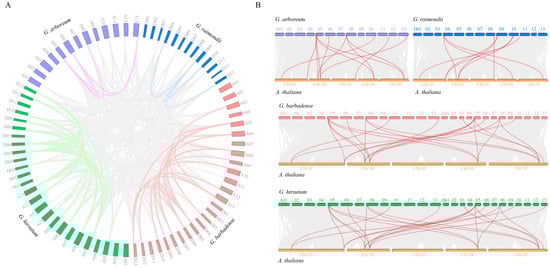 Collinearity analysis of cotton AHA genes across multiple genomes. (A) Collinearity analysis of the AHA duplicated gene pairs in G. hirsutum, G. barbadense, G. arboretum, and G. raimondii. The syntenic AHA gene pairs within the cotton genomes are shown with different colored lines, and those between the cotton genomes are shown as grey lines. (B) Collinearity analysis of the AHA gene pairs of cotton with Arabidopsis.