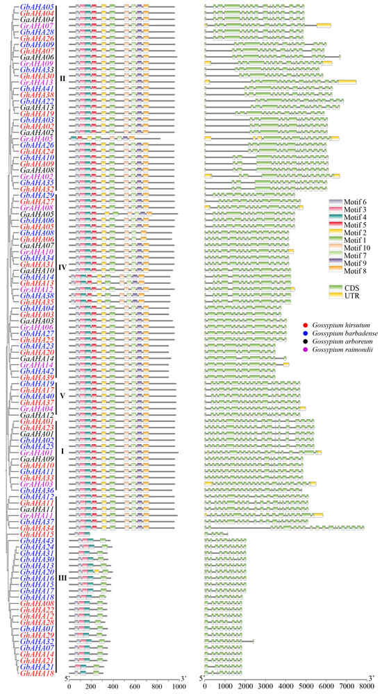 The structure of the cotton AHA genes. Clustering was conducted via MEGA, and the genes identified from different cultivars are shown in different colors. The roman numerals represent the type that genes belong to. The conserved motifs on the left were obtained via MEME, which corresponds to Figure S1, and the bar below refers to the amino acid length of the AHA protein. The exon–intron patterns on the right are summarized from the genome annotation file, and the bar below shows the length of the nucleic acid fragment where the gene is located.