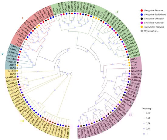 The phylogenetic tree of the cotton AHA family was constructed from 107 protein sequences via the neighbor-joining (NJ) method, excluding GbAHA39, GbAHA16, and GhAHA36 because of their insufficient length. Additionally, the AHA genes from Arabidopsis and rice were incorporated to facilitate the classification of the family types (refer to Table S2). The resulting phylogenetic tree is depicted in Figure 4, where the high bootstrap values indicate the tree’s accuracy. On the basis of prior studies in Arabidopsis, members of the AHA family were categorized into five distinct types, I–V. The number of cotton AHA genes from different species that were distributed on each type was 12, 30, 29, 30, and 6 from type I to type V, respectively. Notably, these genes from various cotton species predominantly clustered within the same clade, which was distinct from the clustering of the Arabidopsis and rice genes. This finding suggests considerable genetic divergence between the cotton AHA genes and those of Arabidopsis and rice, potentially indicating an independent evolutionary trajectory for the cotton AHA gene family. This divergence may offer insights into the novel functional roles of these genes.