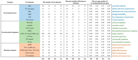 The cis-acting elements within the gene promoter sequence play crucial roles in influencing gene expression and regulation. To gain a deeper understanding of the expression characteristics of cotton AHA genes, a 2 kb region upstream of the AHA transcription start site in the genomic DNA was analyzed to identify the cis-acting elements. The findings were categorized and are presented statistically in Figure 5. The numbers of cis-acting elements identified in the cotton AHA gene promoters of G. barbadense, G. hirsutum, G. arboreum, and G. raimondii were 885, 729, 281, and 321, respectively. In the categories of environmental stress, the cis-acting elements of cotton AHA genes are associated with anaerobic induction, defense and stress responsiveness, drought inducibility, and low-temperature responsiveness. Within the growth and development categories, eight distinct types of cis-acting elements were identified, with the light-responsive type being the most prevalent. Conversely, in the five categories related to the hormone response, the cis-acting elements are distributed relatively uniformly across numerous promoters of the cotton AHA genes. These findings indicate that the expression of the AHA genes is predominantly regulated by environmental stress and hormone responses rather than the growth and development pathways.