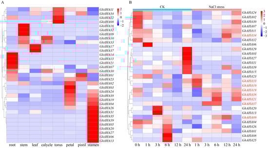 The expression patterns of cotton AHA genes in multiple tissues (A) and under NaCl stress (B). The genes that respond to stress are highlighted in red in the heatmap.