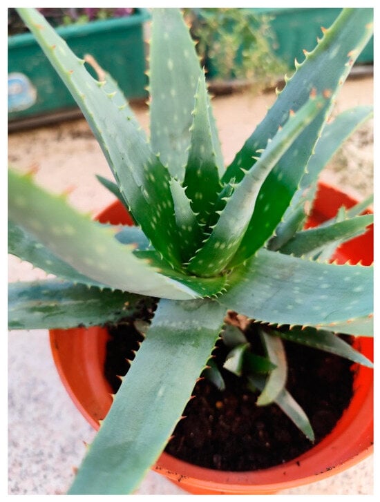 Aloe barbadensis (Figure 2), widely known as aloe vera, is a succulent plant in the Asphodelaceae family, traditionally used for its skin-soothing and healing properties [34]. Native to arid regions of the Arabian Peninsula, it has been cultivated worldwide, particularly in tropical and subtropical areas, due to its medicinal potential [35,36]. Aloe vera gel, the clear, mucilaginous substance within the leaves, has long been applied for skin ailments, including burns, wounds, and pruritus. The plant’s hydrating, anti-inflammatory, and antimicrobial properties have made it popular in dermatology, especially for managing skin irritation and inflammation [34,37].