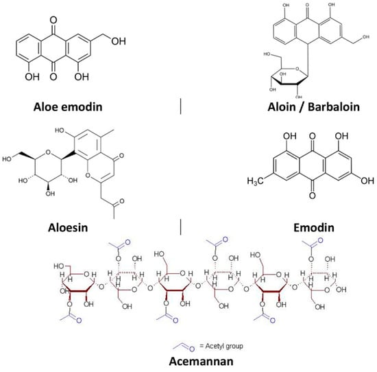 Chemical structure of compounds isolated from Aloe barbadensis with pharmacological activity. Adapted from Sánchez et al. (2020) [37].