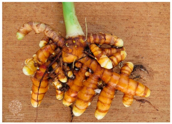 Turmeric, Curcuma longa L. (Figure 6), belongs to the ginger family Zingiberaceae, a perennial plant moderately tall, with underground rhizomes that are mostly ovate, pyriform, oblong, and often short-branched [126]. The most common synonyms are Curcuma domestica Vale, Curcuma domestica Loir, Amomum curcuma Jacq, Curcuma, yellow root, sun root, Indian saffron, and yellow ginger. It is cultivated in tropical and subtropical regions like Pakistan, Nepal, Thailand, Cambodia, China, Japan, Indonesia, Malaysia, Madagascar, Philippines, Peru, Jamaica, and Haiti but is native to India, Bangladesh, and Sri Lanka [127].