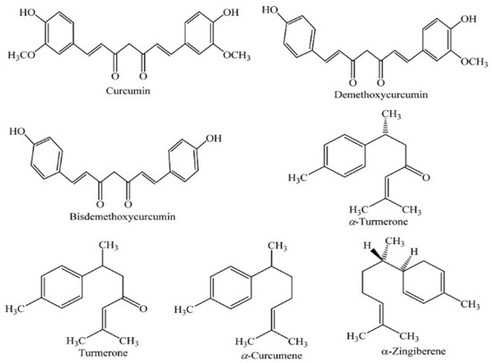 The volatile oils are turmerone (anti-inflammatory and antimicrobial properties), atlante (potential neuroprotective effects), and zingiberene (active in anti-inflammatory and antioxidant properties of turmeric). Turmeric also has polysaccharides, which are associated with immunomodulatory effects, the protein turmerin, which has antioxidant properties, and some vitamins (such as vitamins C and B), minerals (such as manganese, iron, and potassium), and essential oils, which contribute to aroma and additional therapeutic effects [149]. Figure 7 shows the major active compounds in turmeric.