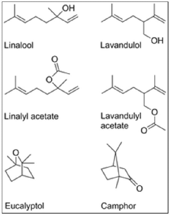 - López, V.; Nielsen, B.; Solas, M.; Ramírez, M.J.; Jäger, A.K. Exploring Pharmacological Mechanisms of Lavender (Lavandula Angustifolia) Essential Oil on Central Nervous System Targets. Front. Pharmacol. 2017, 8, 280. [Google Scholar] [CrossRef] [PubMed]