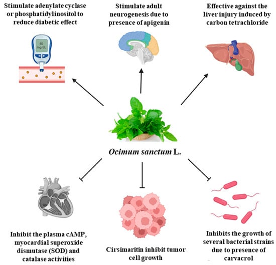 More than 125 varieties of medicinal plants are utilized in allopathic medications, indicating that medicinal plants are useful not just for the creation of Ayurvedic and Unani medicines but also for allopathic medicines [105]. The anthelmintic activity in an in vitro model utilizing Caenorhabditis elegans is attributed to the essential oil derived from O. sanctum L. [106]. O. sanctum L. is known to be a good mosquito repellent and to have strong larvicidal properties [79]. Culex quinquefasciatus, Anopheles stephensi and Aedes aegypti are just a few of the mosquito species it is known to be effective against.