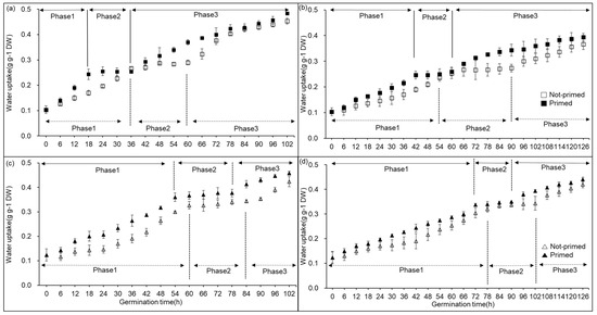 The changes in the water uptake in rice seeds of two varieties during seed germination. (a,b) represent “Kasalath”, and (c,d) represent “Nipponbare”. (a,c) represent well-watered conditions, and (b,d) represent osmotic stress conditions during seed germination. The bars in (a–d) represent standard error (S.E.). Each germination phase of 1, 2, and 3 represents imbibition, plateau, and post-germination, respectively.