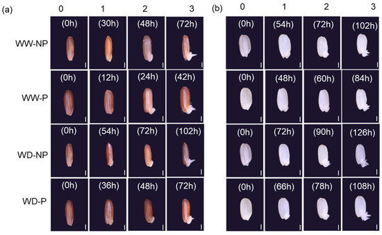 Morphological and structural changes in each phase for non-primed (NP) and primed (P) in “Kasalath” (a) and “Nipponbare” (b) under well-watered (WW) and water-deficit treatments (WD, 15% PEG6000). The 0 represents before water imbibition and 1 represents stages with the rapid absorption of water, 2 represents the stage of a plateau in water content, and 3 is the stage of radicle appearance. Scale bar = 1 mm.