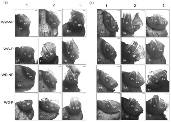 Longitudinal sections of “Kasalath” (a) and “Nipponbare” (b) embryos. Changes in well-watered (WW) and water-deficit treatment (WD, 15% PEG6000) conditions with not-primed (NP) and primed (P) according to each phase. The 1 represents the phase with the rapid absorption of water, 2 is the stage of a plateau in water content, and 3 represents the stage of radicle appearance. EN: endosperm; CO; coleoptile; PL: plumule; RA: radicle. Scale bar = 100 μm.