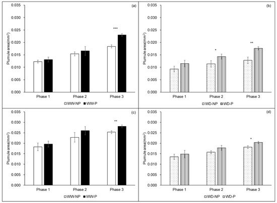 Comparison of the area of a plumule in the two varieties (see Figure 2). (a,b) represent “Kasalath” and (c,d) represent “Nipponbare”. The bars in (a–d) represent standard error (S.E.). The differences in the effect of seed priming on the plumule area of seeds germinated under control (well-watered, WW) and water-deficit (WD, 15% PEG6000) conditions were evaluated (for each step of seed germination separately) using Welch’s t-test. *, **, and *** indicate a significant difference (p < 0.05, p < 0.01, and p < 0.001, respectively).