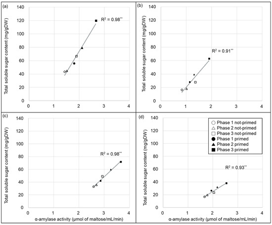 Relationship between α-amylase activity and total soluble sugar content of the two varieties. (a,b) represent “Kasalath” and (c,d) represent “Nipponbare”. (a,c) represent well-watered conditions and (b,d) represent water-deficit conditions (15% PEG6000). ** indicates significant difference at the 0.01 level (p < 0.01).