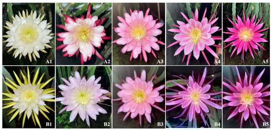 Genetic composition and improvements in plant traits play critical roles in determining fruit quality, yield, and shelf life. At present, two primary types of pitaya white-flesh (H. undatus) and red-flesh (H. monacanthus) are widely cultivated on a commercial scale. In recent years, significant efforts in cross-breeding have led to the development of new pitaya varieties, each selected for desirable traits aimed at meeting market demands [11,12], seedling selection [13,14,15,16,17,18], and bud mutation selection [19,20,21]. Elucidation of the genetic laws of traits is an important foundation for fruit breeding that has been reported in longan [22], apple [23], mango [24], and cowberry [25]. Flowers play a vital role as the reproductive organs of plants, and their genetic traits are key to successful pollination and fruit development. Recently, there has been increasing interest in understanding the genetic basis of flower traits in fruit trees, driven by the diversity in phenotypic characteristics across various species. Studies have highlighted the extensive phenotypic variation in flower traits within germplasm resources of several fruit trees, including pear, which holds potential for improving breeding strategies and enhancing crop resilience [26], apricot [27], olive [28], cherry [29], and jujube [30].