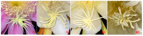 Traits of the flowers, fruits, and stems of two parents and their F1 progenies were recorded according to the Guidelines of Hylocereus descriptors [31]. Flower length, corolla width, and calyx tube width were measured in the afternoon before the opening of pitaya flower at night. The number of petals, development of stigmas, number of stigmatic lobes, and the distance from stamen to stigma were recorded at about 10:00 in the evening.