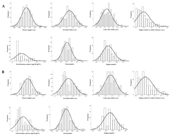 Seven main traits of F1 progeny from cross combinations of ‘HHQL’ × ‘HL’ and ‘HL’ × ‘HHQL’ including flower length, perianth width, calyx tube width, stigma relative to anther distance, betalain content in petals, and the number of petal and stigma were analyzed. The phenotypic values for seven flower traits in most offspring fell within the range observed in the parental lines ‘HHQL’ and ‘HL’ pitayas, with some individuals displaying traits that exceeded parental values. As shown in Figure 3, characteristics such as flower length, perianth width, calyx tube width, stigma-to-anther distance, betalain concentration in petals, and the number of petals and stigmas showed either a normal or slightly skewed distribution. These patterns indicate that these seven flower traits are quantitative and likely controlled by multiple genes.