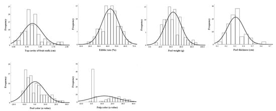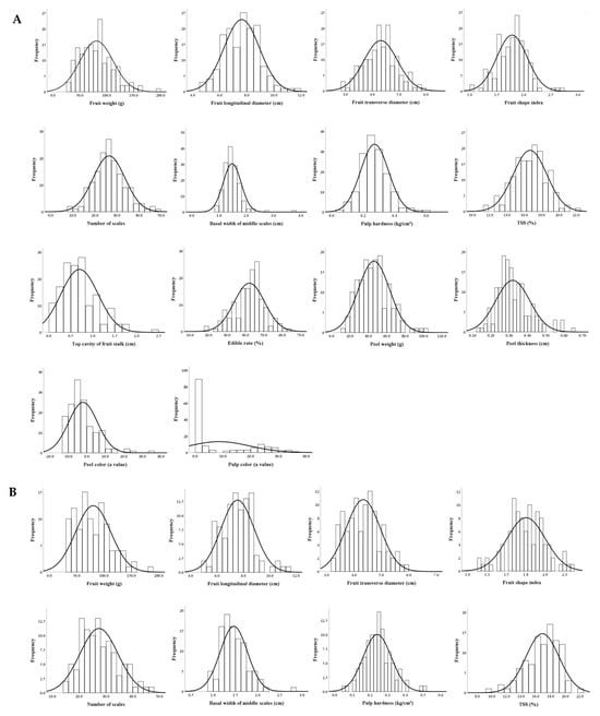 A comprehensive analysis was conducted on fourteen key fruit traits in F1 progenies from the ‘HHQL’ × ‘HL’ and ‘HL’ × ‘HHQL’ cross combinations. These traits included fruit weight, longitudinal and transverse diameters, shape index, scale count, basal width of middle scales, flesh hardness, TSS content, top cavity of the fruit stalk, edible rate, peel weight, and thickness, as well as peel and pulp color. All traits displayed either normal or skewed normal distribution patterns (Figure 5), indicating that they are quantitative traits likely controlled by multiple genes. This distribution suggests that these fruit characteristics are influenced by a combination of genetic factors, offering valuable insights for breeding programs aimed at optimizing fruit quality and yield in pitaya.