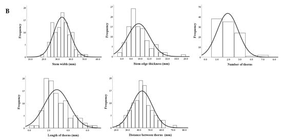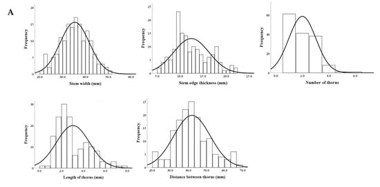 Five key stem traits including stem width, edge thickness, thorn number, thorn length, and distance between thorns were analyzed in the F1 progenies of the ‘HHQL’ × ‘HL’ and ‘HL’ × ‘HHQL’ cross combinations. Each of these traits exhibited a normal distribution, suggesting that they are quantitative traits likely influenced by multiple genes. This distribution pattern highlights the potential for controlled genetic selection in future breeding efforts to optimize these stem characteristics for improving growth and resilience in pitaya (Figure 6).