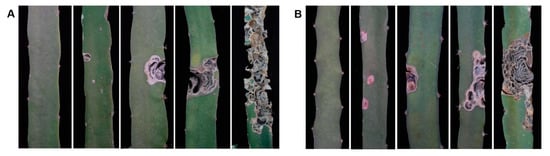 Stem width, edge thickness, thorn length, distance between thorns, fruit longitudinal and transverse diameters, top cavity, peel thickness, and width of the base of middle calyx were measured using a digital vernier caliper (Shanghai Manette Industries (Group) Co., Ltd., DEGUQMNT, Shanghai, China). TSS content in the center of fruit pulp was determined using a digital refractometer. The color of peel and pulp was measured using a colorimeter. Pitaya canker disease was investigated according to the Supplementary Table S6.