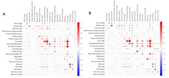 Correlation analysis of flower and fruit traits from ‘HHQL’ × ‘HL’ (A) and ‘HL’ × ‘HHQL’ (B) cross combinations. Circle sizes and color shade stand for degree of correlation. The lager circle sizes and the darker color mean the more significant degree of correlation.