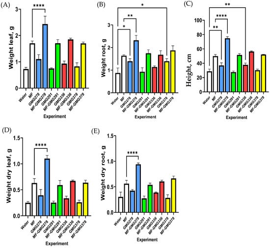 Diagrams of agronomic indicators of plants after treatment with bacteria and mineral fertilizer. (A) the weight of the aboveground part of the plant, (B) the weight of the underground part of the plant, (C) the height of the plant, (D) the dry weight of the aboveground part of the plant, (E) the dry weight of the underground part of the plant. *—p (p values) < 0.05, **—p < 0.01, ****—p < 0.0001.