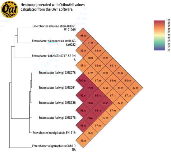 Alignment to the complete genomes of Enterobacter sp. by OrtoANI analysis. OrthoANI measures the overall similarity between two genome sequences. The threshold for species discrimination is 95~96%. The genomes for comparison were downloaded from the online accessible database https://www.ncbi.nlm.nih.gov/datasets/genome/ (accessed on 6 October 2024).