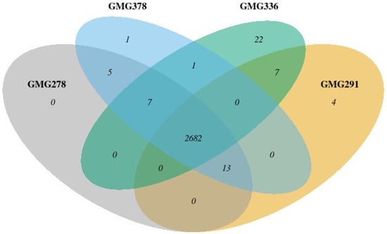 To compare all genes annotated in KeggOrthology, a Venn diagram was constructed (Figure 3). All genes unique to the strains and annotated in the KeggOrthology database are listed in Table 3. It can be noted that strains GMG_278 and GMG_378 were almost identical, except for the only protein with an unknown function. Strain GMG_291 had distinctive genes of proteins of the O-antigen system and DNA repair. Strain GMG_336 had distinctive genes of proteins involved in carbohydrate metabolism and genes of the O-antigen system, as well as several genes of efflux pumps.