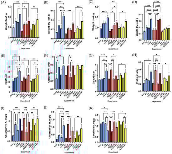 Diagrams of morphological and physiological parameters of plants under stress conditions in experiments. Legend (MF—mineral fertilizer, 278—microbial fertilizer, NaCl—watering with 1% NaCl solution, PEG—watering with 10% PEG solution). (A,B) the weight of the wet (A) and dry (B) aboveground part of the plant; (C,D) the wet weight (C) and dry weight (D) of the underground part of the plant; (E) height of the plant; (I–K) the amount of pigment: chlorophyll A (I), chlorophyll B (J), carotenoids (K); (H) the amount of proline; (F,G) quantity ratio ChlA/ChlB (F), ChlA+B/car (G). *—p (p values) < 0.05, **—p < 0.01, ***—p < 0.001, ****—p < 0.0001.